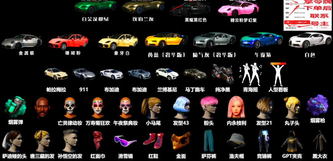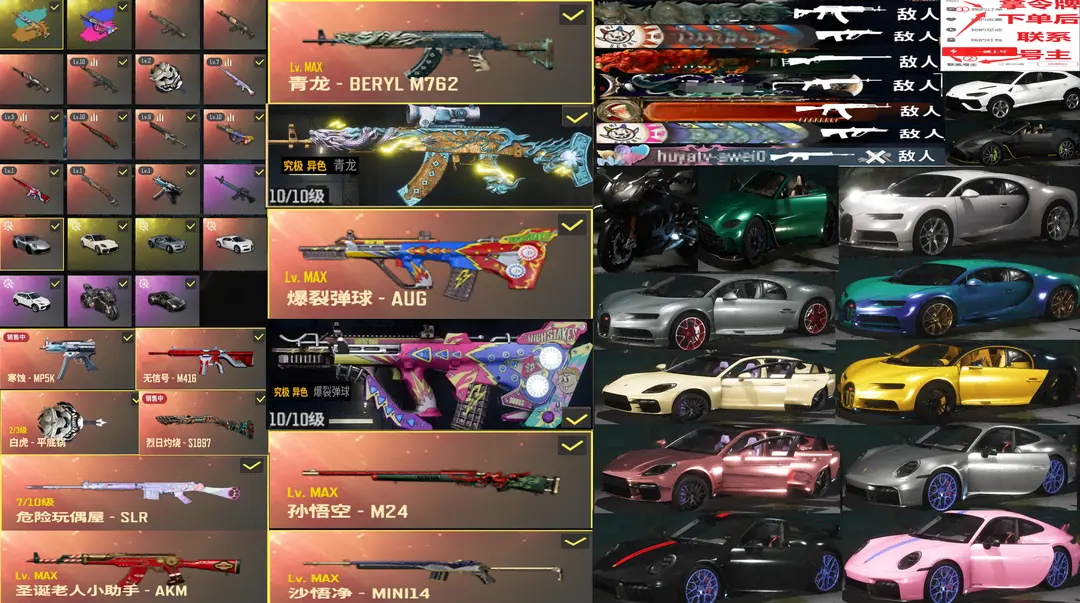 全车布加迪威龙保时捷911✅⑩异色金龙青龙M762⑩异色AUG⑩M24悟空满级迷你AK杜卡迪可排位