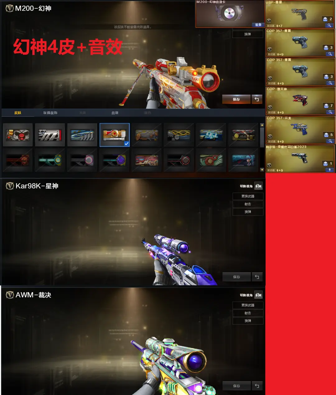 排位:可以、、、、、、、、、、、、爆破四防:幻神4皮+音效(24AG冠军、N9、星耀、电流骇客皮肤)、98K星神、USP雷暴、2个COP雷霆、COP堕天神、COP云龙、23白鲨柯尔特、传说圣谕、G36幻影、玄豹白虎、白虎、QBZ金色蔷薇、、、幻神音效、蔷薇音效、毁灭音效、黑龙音效、、、5套雷霆、1套堕天神、1套幻灵、3套竞技荣光、7套玄豹、1套雷暴王者、1套雷霆王者、、、爆破四防(传说女帝、云悠悠、玄豹、隼、王者影豹)