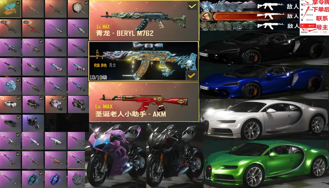 布加迪威龙迈凯伦杜卡迪跑车✅⑩异色金龙青龙M762满级AK圣诞小丑女黑人滑雪柏林战神悲喜粉头可排位