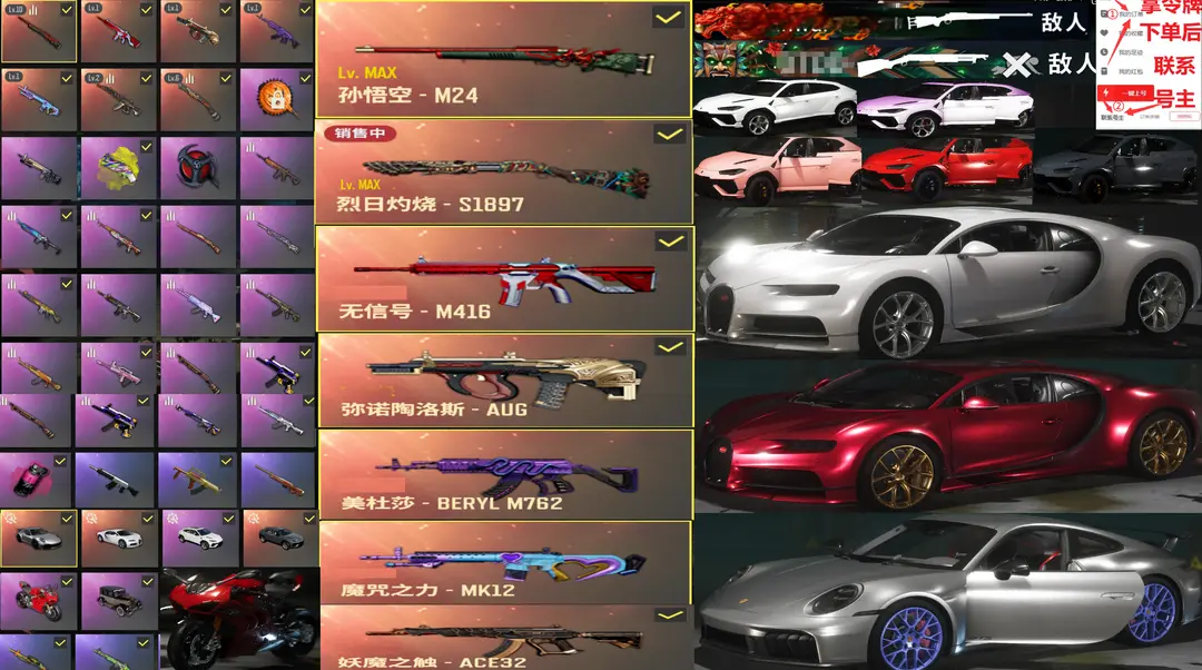 保时捷911布加迪兰博基尼杜卡迪✅⑩M24悟空满级烈日S189信号魔女妖魔M4AUG美杜莎战神柏林位