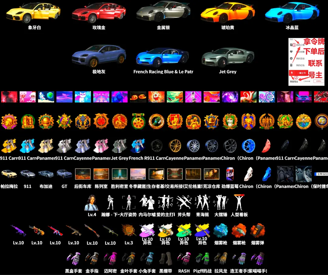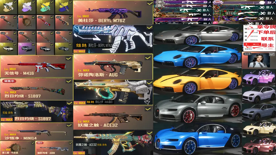 10满神器全车布加迪保时捷911✅⑩异色美杜莎⑩异色AUG⑩M4⑩异色ACE⑩烈日喷⑩迷你瀚娜可排位