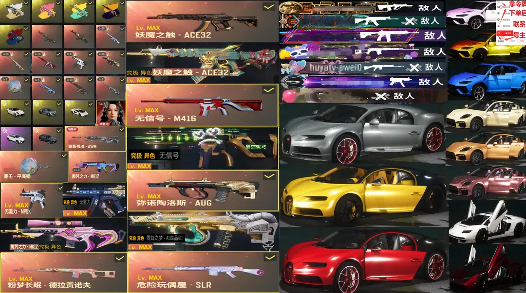 20神器30车布加迪保时捷兰博基尼✅⑩异色ACE⑩M4信号⑩AUG⑩玩偶炮⑩粉梦满级MP5瀚娜可排位