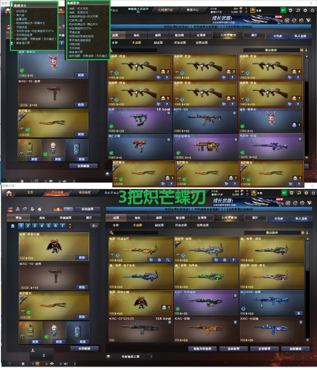 排位:可以、、、、、、、、、、生化四防:(可以变更背包、查看生化僵尸血量):无需换弹、6烈龙、斯泰尔萌兔、异变镇魔者、双面神、、死亡之眼、MAC涂鸦、3把炽芒蝶刃、手斧镜、超级对讲机、生化减速雷、生化常用弹匣、、、、、、、、、、爆破四防全装:幻神9皮+音效(KZ冠军、EP荣耀世冠、宠儿、N9、曹操、周瑜、巅峰荣耀、冠军之幻、黄忠皮肤)、M200-竞技荣光、王者星神、98K星神-量子之心、、、、USP雷暴、USP雷暴王者、3个USP神工天巧、2个柯尔特竞技荣光、COP堕天神、无冕之王、COP雷霆王者、冠军之特、量子之心左轮、USP深海特遇队、、、、、神威莲华、加利尔ACE-天袭、G36幻影、FAMAS G2-天戎、九霄圣角、传说暗裔、白虎、QBZ金色蔷薇、、、幻神音效、裁决音效、蔷薇音效、九霄圣角音效、毁灭音效、雷神音效、火麒麟音效、黑骑士音效、、、7套量子之心、1套电竞装甲、1套幻灵、3套竞技荣光、5套雷霆王者、、、生化四防(神威莲华、毒蝰术士)爆破四防(传说女帝、宋雨琦、鹰、妮妮、云悠悠、雨棠)
