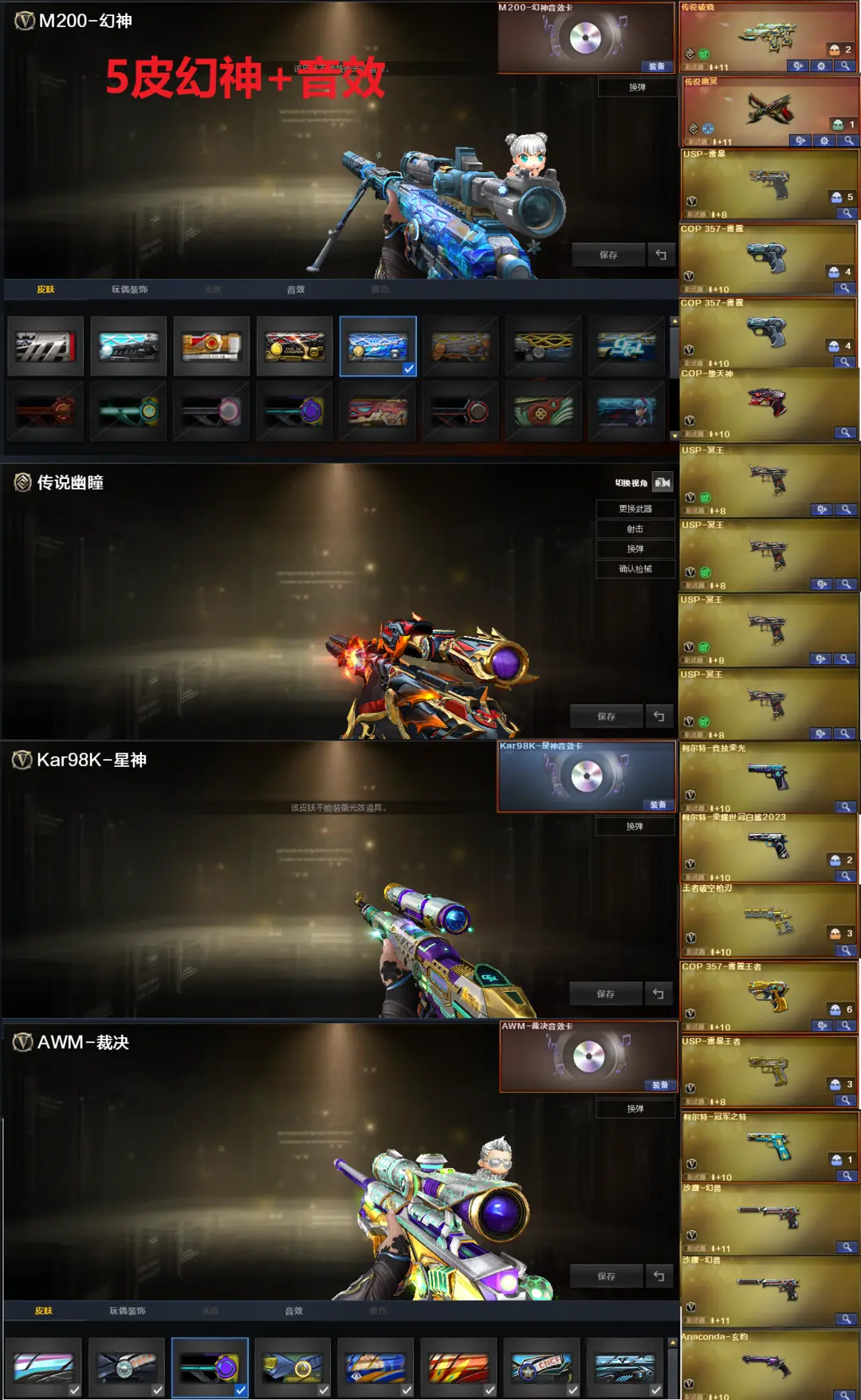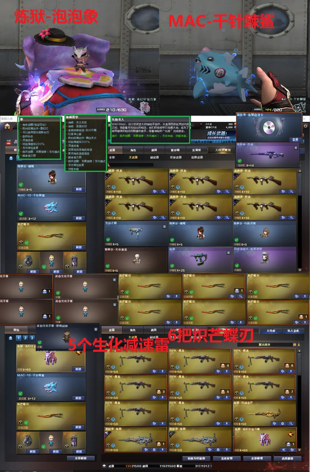 排位:可以、、、、、毒蜂+清道夫可以无限子弹、、、、生化四防极品:(变更背包、看僵尸血量):无需换弹、6烈6盘、炼狱+音效、炼狱-泡泡象、斯泰尔蝴蝶、斯太尔幻面灵狐、斯太尔-天外旅者、传说圣灵、毒蜂、异变清道夫-小人枪、双面神、死亡之眼、MAC千针棘鲨、6把炽芒蝶刃、5生化减速雷、生化常用弹匣、、、、、、爆破四防全装:幻神5皮+音效(EP荣耀、24AG冠军、23白鲨、星耀、AG皮肤)、传说幽瞳、王者幻神、M200-竞技荣光、98K星神、、、、传说破晓、传说幽冥、USP雷暴、4个USP冥王、COP堕天神、柯尔特竞技荣光、23白鲨柯尔特、USP雷暴王者、冠军之特、、、、G36幻影、加利尔-天袭、天戎、传说光耀、传说暗裔、传说夜影、白虎、QBZ金色蔷薇、、、幻神音效、裁决音效、星神音效、幻影音效、炼狱音效、蔷薇音效、白虎音效、毁灭音效、雷神音效、火麒麟音效、黑龙音效、、、、2套幻兽、全套手雷、、、生化四防(神威莲华、隼、礼物老人)、爆破四防(传说女帝、传说艾莉莎、传说星骇、等)