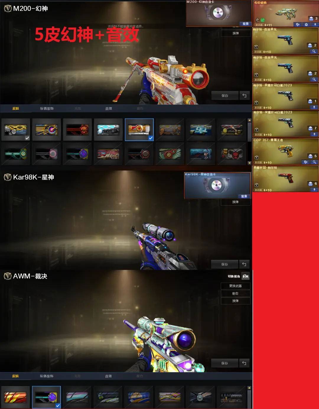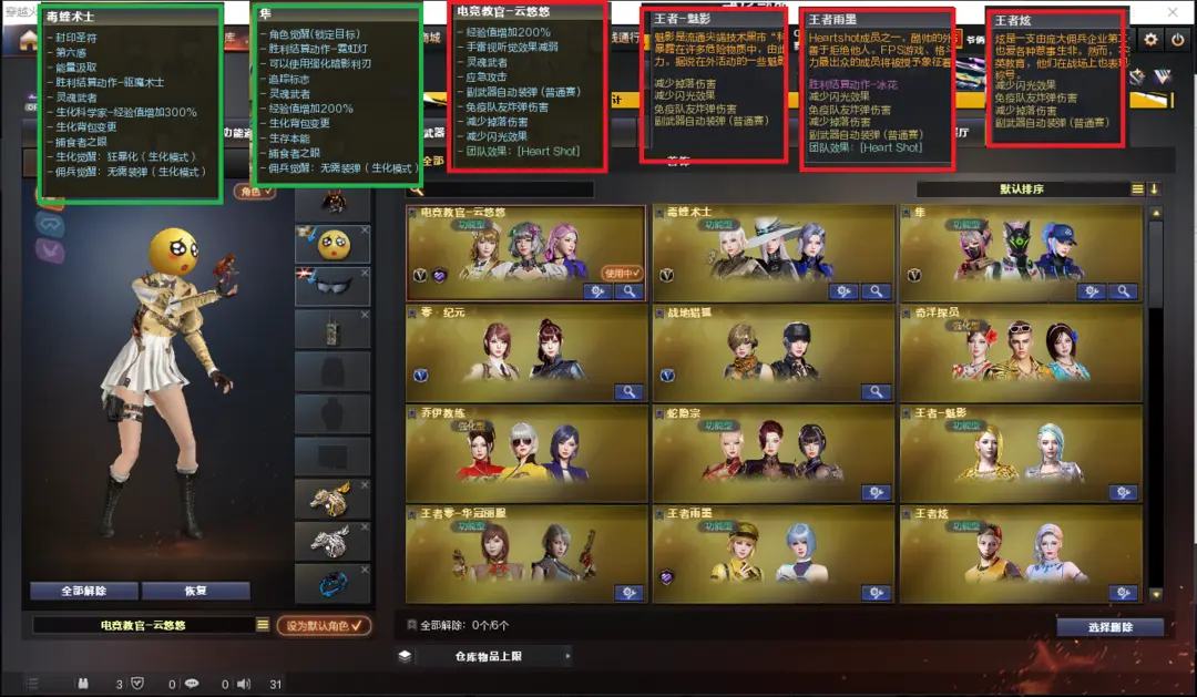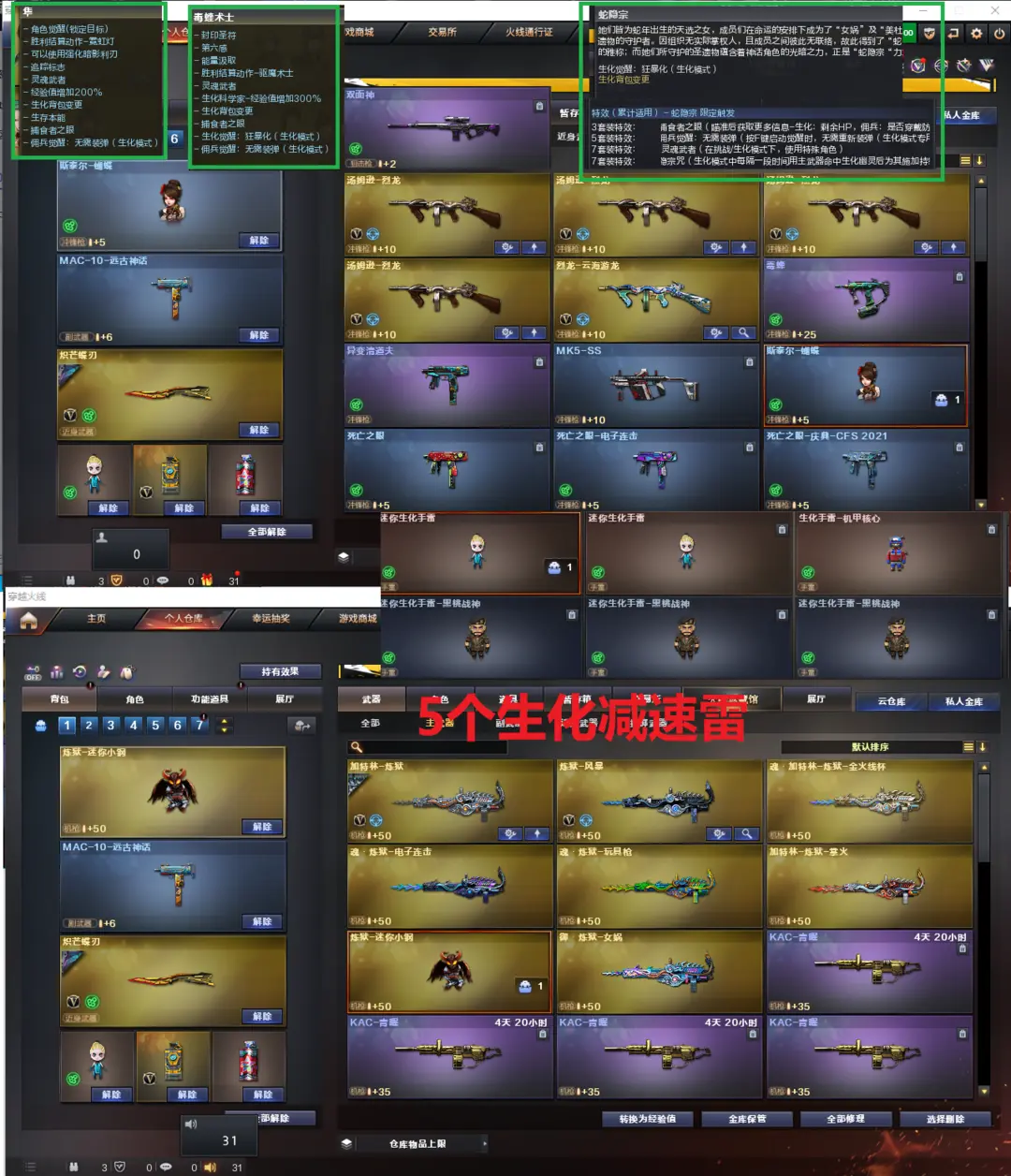 排位:可以、、、、、、、、、、生化四防全装:(可以变更背包、查看生化僵尸血量):无需换弹、5烈龙、炼狱小刚、、斯太尔蝴蝶、毒蜂、异变清道、双面神、死亡之眼、MAC-涂鸦、炽芒蝶刃、手斧镜、5个生化减速雷、超级对讲机、全部弹匣、、、、、、、、、、、、爆破四防:幻神5皮+音效(24AG冠军、23白鲨、幻神-Heartshot皮肤、丹凤、周瑜皮肤)、98K星神、M200-竞技荣光、王者星霆、传说破晓、2个柯尔特竞技荣光、2个23白鲨柯尔特、世冠柯尔特、COP雷霆王者、G36幻影、白虎、QBZ金色蔷薇、、、幻神音效、星神音效、蔷薇音效、、、3套幻灵、3套竞技荣光、2套云龙、4套雷霆王者、、、生化四防(毒蝰术士、隼、蛇影宗)爆破四防(云悠悠、王者魅影、王者雨墨、王者炫)