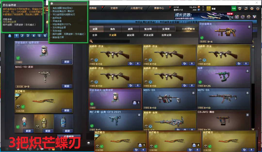 排位:可以、、、、、、、生化四防全装(变更背包、可以看僵尸血量):无需换弹、5烈龙、炼狱、毒蜂、异变清道夫-小人枪、异变清道夫、死亡之眼、MAC-涂鸦、3把炽芒蝶刃、手斧镜、生化减速雷、超级对讲机、全部弹匣、、、、、、爆破四防:幻神5皮+音效(权、YZK、KZ、EP荣耀、冠军之幻)、传说幽瞳、M200-竞技荣光、98K星神-量子之心、、、、USP雷暴、USP雷暴王者、3个USP冥王、2个柯尔特竞技荣光、冠军之特、COP王者堕天神、2个量子之心左轮、、、G36幻影、加利尔ACE天袭、神威天绫、FAMAS G2-天戎、白虎、王者凌虎、QBZ金色蔷薇、、、幻神音效、裁决音效、幻影音效、白虎音效、7套竞技荣光、10套玄豹、4套量子之心、1套雷暴王者、、、生化四防(隼、芳心审判者)、爆破四防(传说艾莉莎、妮妮、玄豹、智、王者春)