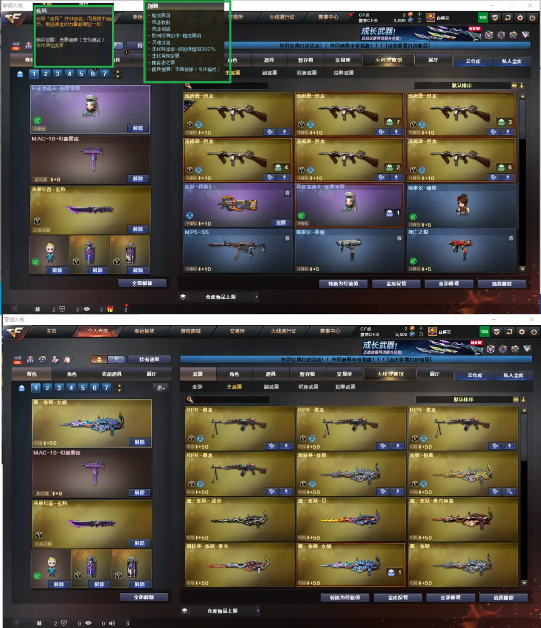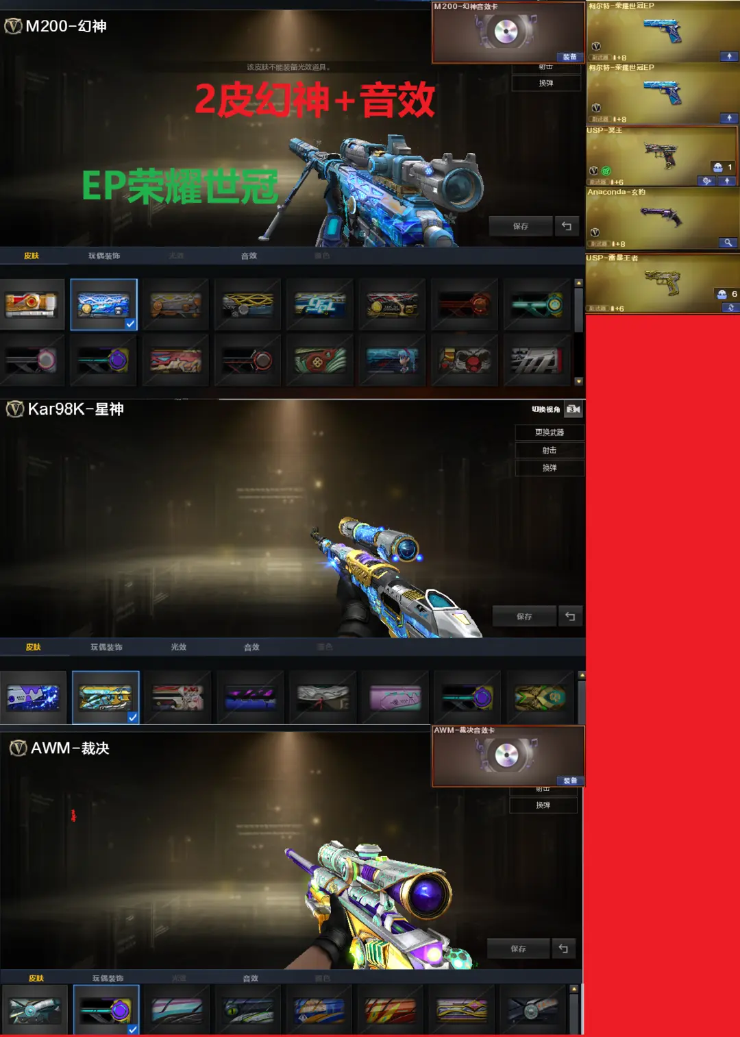 排位:可以-----------------生化四全装(可以变更背包、查看生化僵尸血量):无需换弹、6烈、4盘龙、2炼狱、斯太尔蝴蝶、清道夫-小人枪、死亡之眼、MAC-涂鸦、手斧镜、生化减速雷、超级对讲机、、、、、、、、爆破四防:幻神2皮+音效(EP荣耀世冠、24AG冠军皮肤)、王者幻神、98K星神、、、、2把EP荣耀世冠柯尔特、USP冥王、USP雷暴王者、玄豹左轮、G36幻影、加利尔ACE-天袭、FAMAS G2-天戎、传说圣谕、传说光耀、传说暗裔、白虎、QBZ金色蔷薇、、、幻神音效、裁决音效、毁灭音效、黑骑士音效、、、1套堕天神、6套玄豹、、、生化人物(荆棘、疾风)爆破四防(传说星骇、妮妮、王者春、王者魅影、王者小乔)