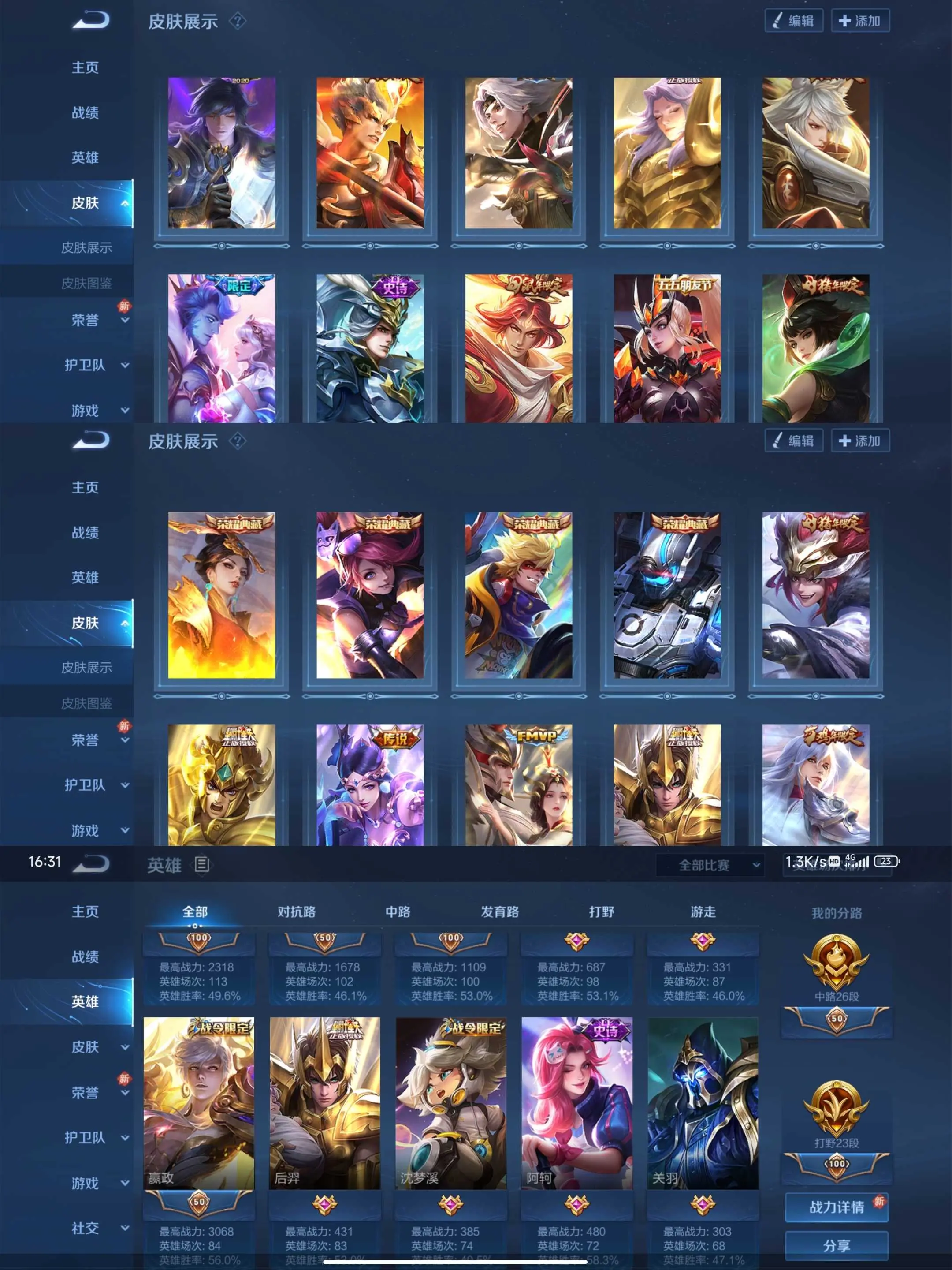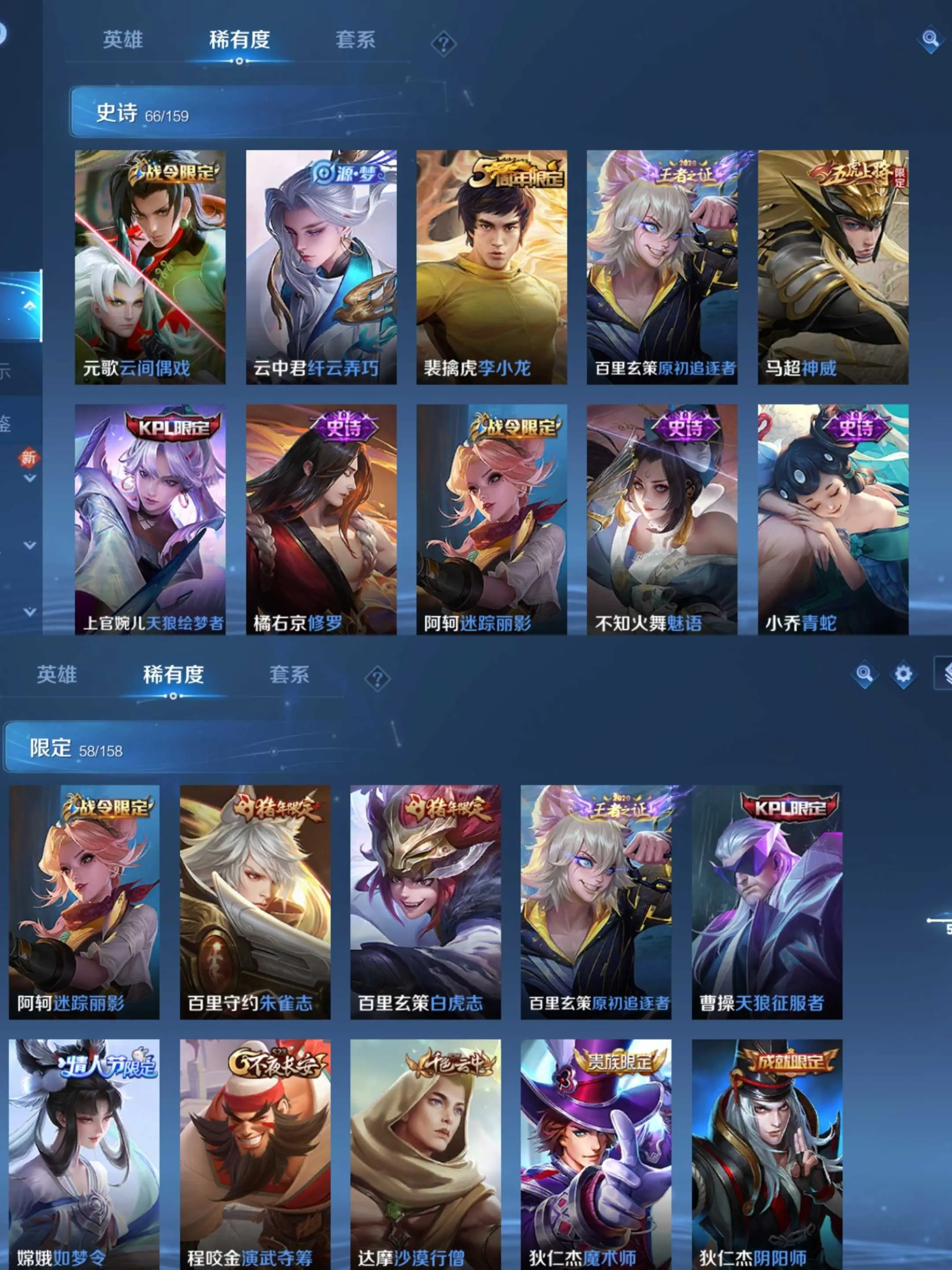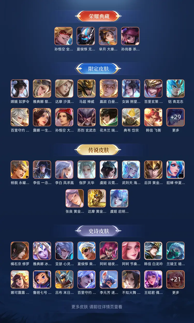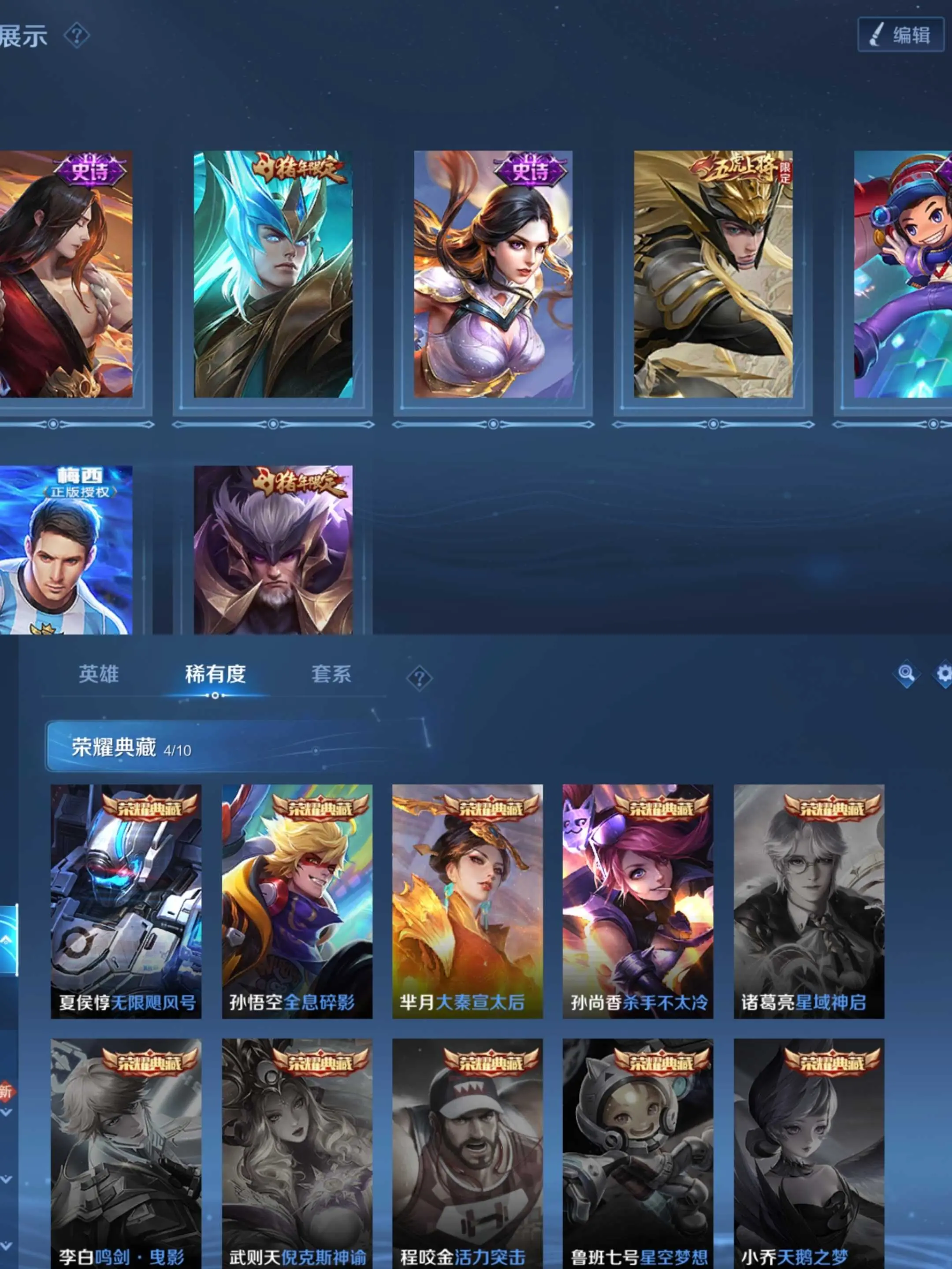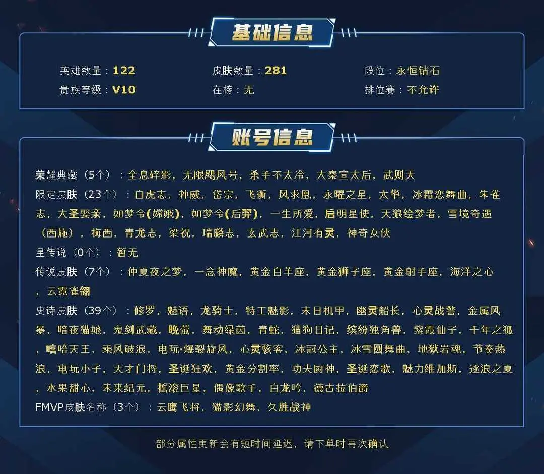 贵族等级V10,段位非凡王者,英雄数量127,典藏皮肤数4,皮肤数量296,梅西/无限飓风号/白虎志/神威/梅西/无限飓风号/白虎志/神威
